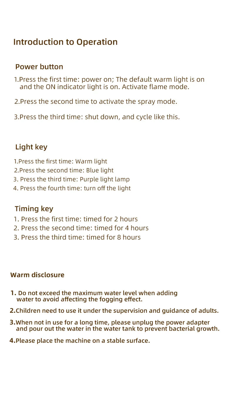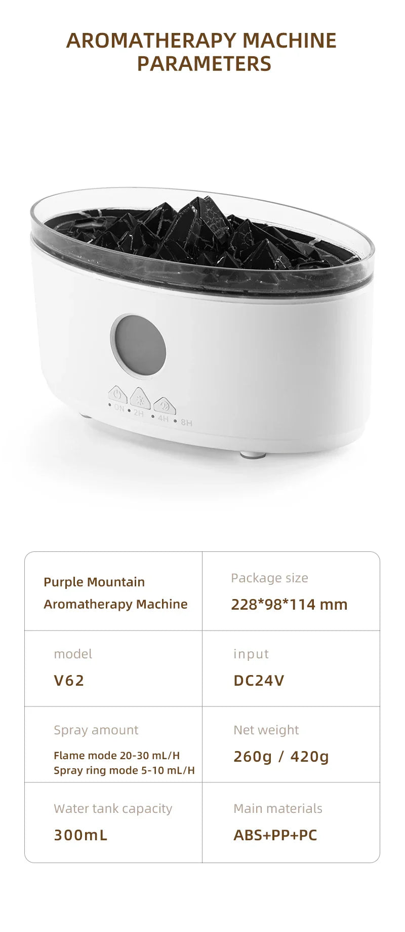 - Mist Output: Flame mode 20-30 ml/H; Spray ring mode 5-10 mL/H